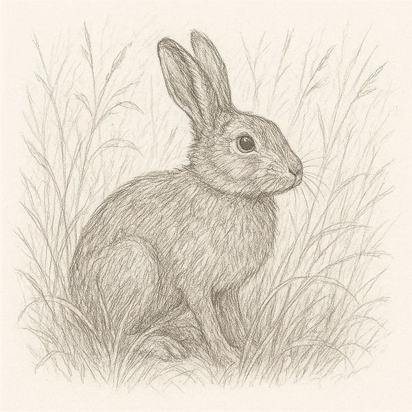 Through a clearing in the trees, a small brown rabbit appears in the muted light—an unexpected gift from the morning. It stands for only a moment, framed by rain-softened branches, a small pulse of wildness in the stillness of the meadow. Then, in a streak of tawny light, it vanishes into the undergrowth, leaving behind the faint impression that something enchanted has just passed through.