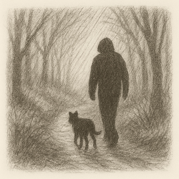 The rain thickens now, heavy enough to darken the earth beneath our feet, but not enough to dampen Carys’ spirit. She trots ahead, raincoat shining, nose pressed to the edges of the path where the wild things dwell. The valley speaks to her in scents and rustles.