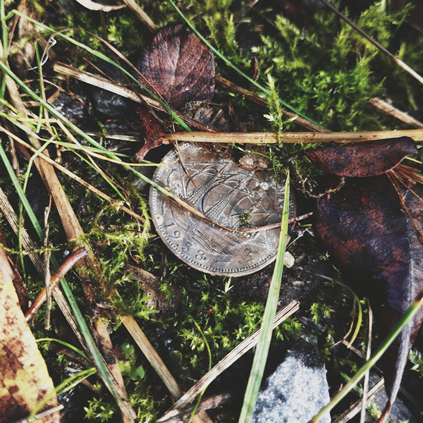 As I watch my footing, something glints faintly in the moss—a small coin, half-buried. A 1958 half penny. I turn it over in my hand, its surface dulled by decades of weather. I wonder who last carried it, and how it came to rest here—a quiet relic of another time.