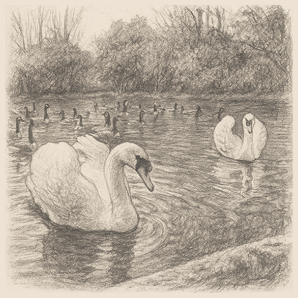 A pair of swans push their way through—white, commanding, gliding with the slow grace of monarchs. Their reflection trembles in the rippling grey—sovereigns of this quiet kingdom.