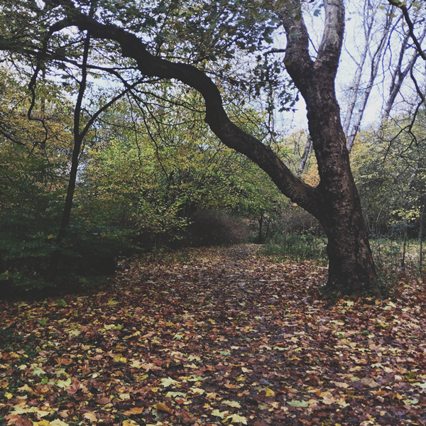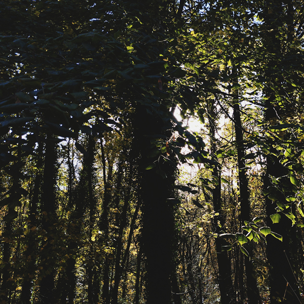 Further ahead, a carved pumpkin rests among the fallen leaves—a relic of Halloween nights past. Only two evenings ago, it proudly guarded a doorstep, its grin inviting children to knock and claim treats. Now, abandoned in the woods, it becomes a modest offering for the creatures that roam here, a reminder that celebrations fade, leaving behind only traces for the wild to reclaim.