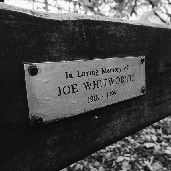 We find a bench and sit. The plaque reads, “In loving memory of Joe Whitworth, 1918–1999.”