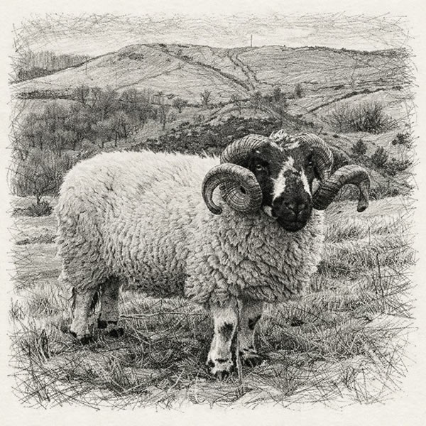 Eventually, we reach the monument and begin our descent. We pass through a flock of sheep, parting to allow us passage. A proud ram, heavy with thick, curling horns, holds his ground and watches us closely. Carys meets his gaze—still, focused, unflinching. After a moment, he yields and retreats, dignity intact.