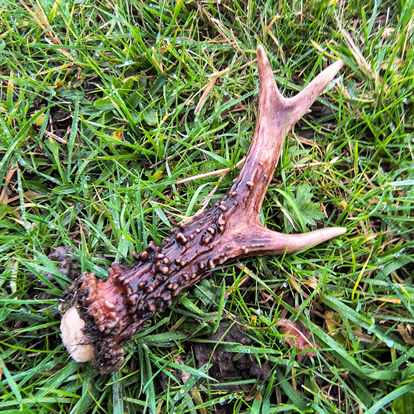 There, resting on the damp earth before me, lies a small antler—its form smooth yet textured, brown at its roots like turned soil, rising into delicate cream tips. An offering of nature, shed by one of the roe deer that wanders quietly through these meadows.