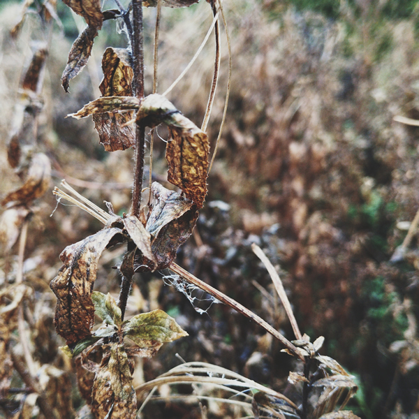 Dewdrops cling to every surface, tiny mirrored pearls catching what little light there is. The once-vibrant greens of summer have faded to deep browns and muted golds.