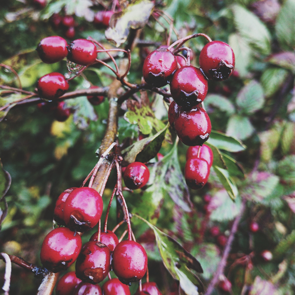 Only a single bush, proud and defiant, carries colour—its branches heavy with clusters of red berries, offering a final echo of life amid decay.