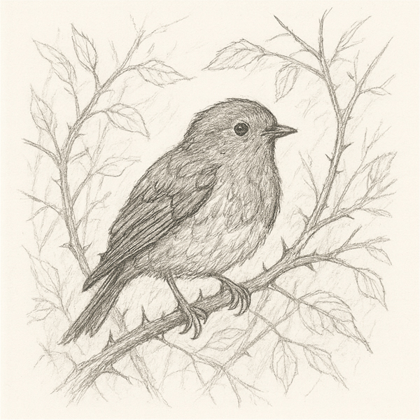A sudden flutter of motion—a robin, bright and curious, emerges from the brambles. It watches us with a tilted head, then hops closer, bold as if posing for a portrait. I reach for my camera, but it vanishes back into the thicket before the shutter can click. Some moments are meant only to be kept in memory.